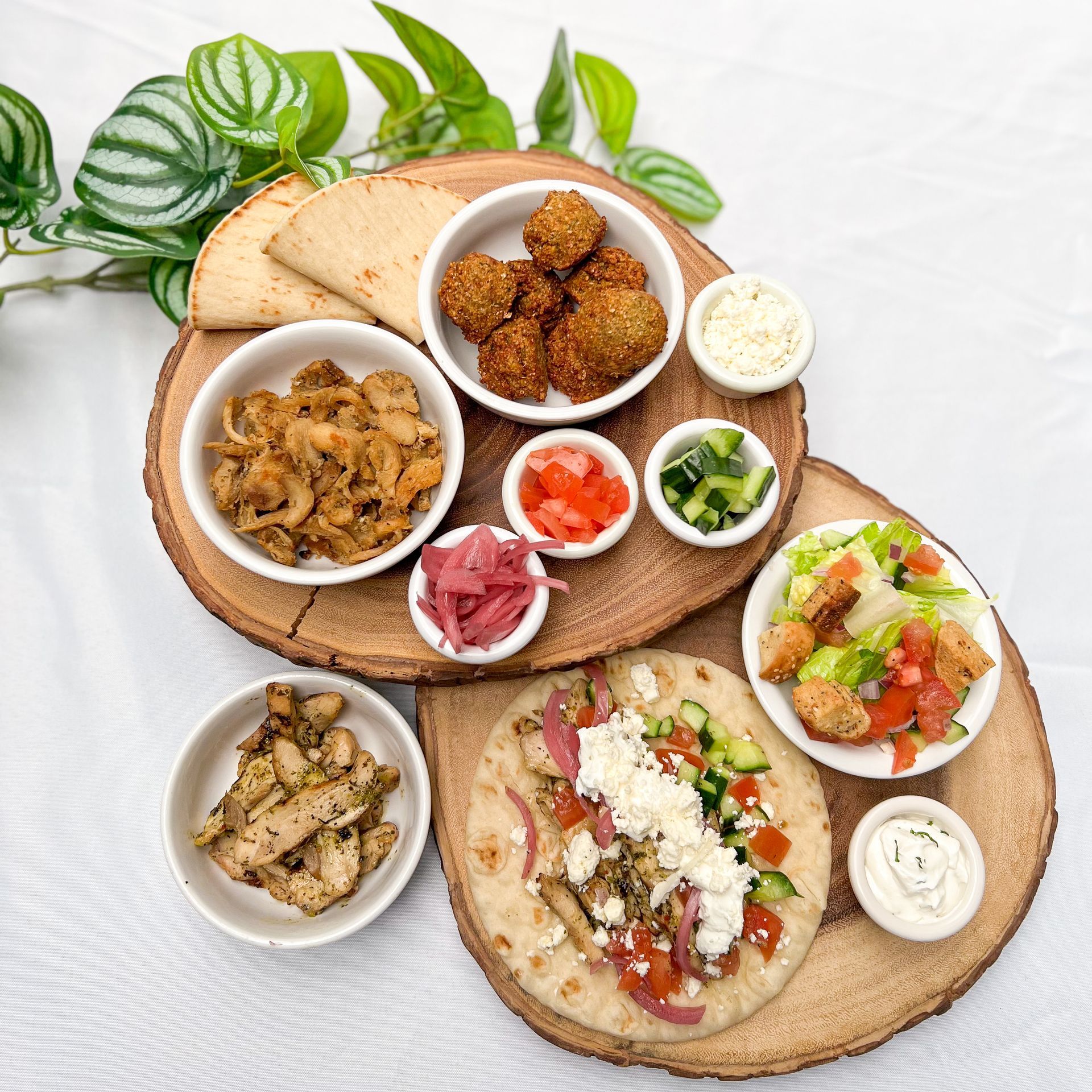 • Pita buffet is plated on a white square plate. Pita is stuffed with chicken, fresh tomatoes and cucumber, pickled red onions, and tazikti sauce. There are falafels beside it.