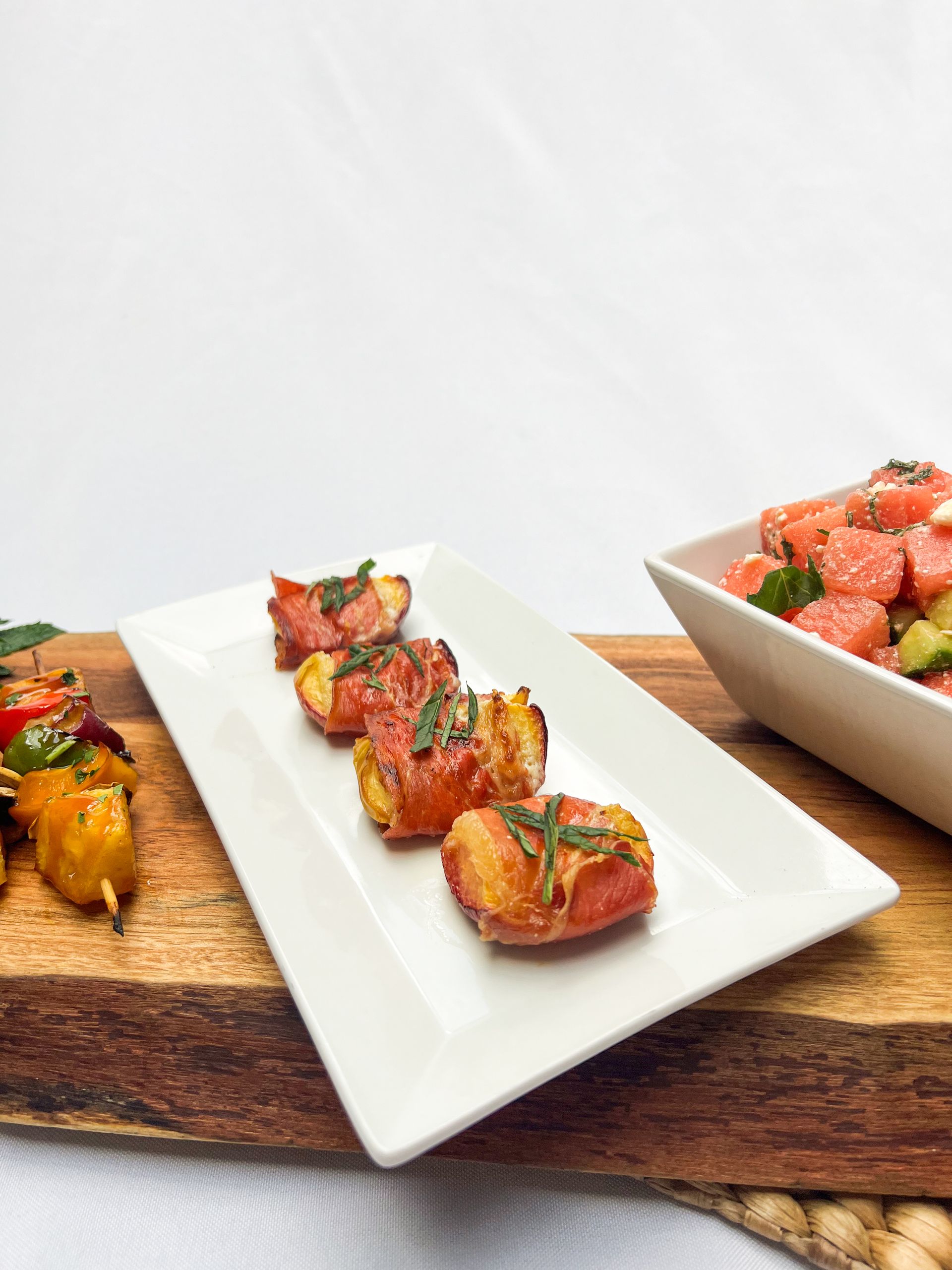 • A platter of perfectly lined up cucumber crostinis on a platter. They are on a riser on a buffet with a fruit platter beside them. The table is under a white tent with greenery in the background.